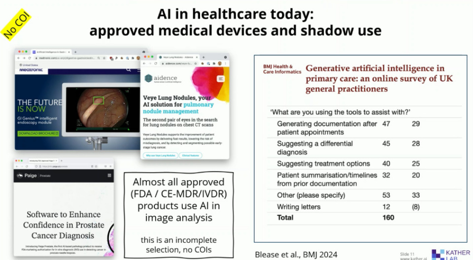 当前,尽管已有获批的AI医疗设备,但其在临床的渗透速度远不及以ChatGPT为代表的通用大模型的“影子使用”(shadow use)。Kather教授引用一项研究称,英国高达20%的全科医生在日常工作中使用此类工具,而真实比例可能更高。他强调,任何情况下都绝不能将患者相关的敏感数据输入公共的商用AI工具,并呼吁各家医院尽快部署安全可控的院内大模型,以规避数据安全风险。