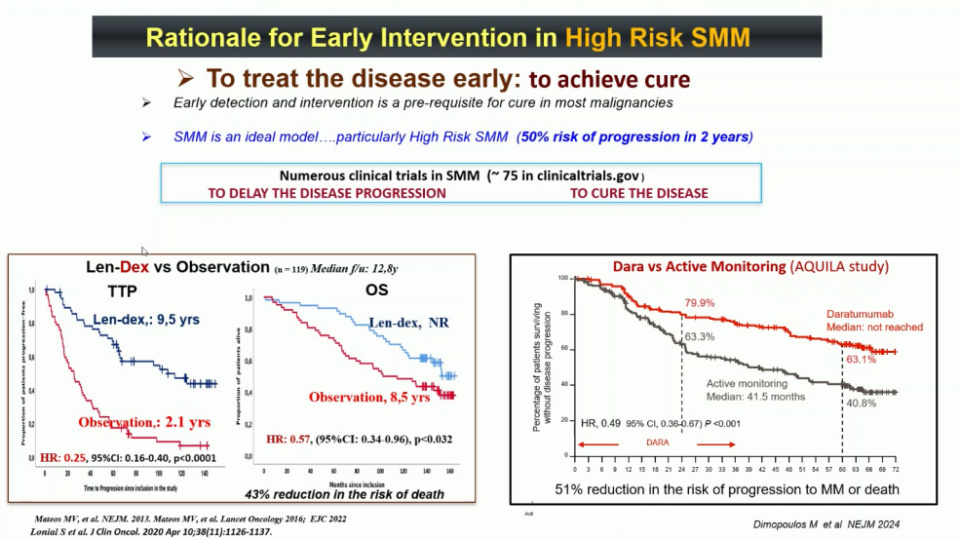 他分享了十余年前西班牙研究组发表的一项里程碑式研究成果:与观察等待相比,来那度胺联合地塞米松的早期干预,将疾病进展时间延迟了整整7年,并降低了43%的死亡风险。近期研究进一步证实,靶向CD38的单克隆抗体单药治疗也能显著降低疾病进展风险。