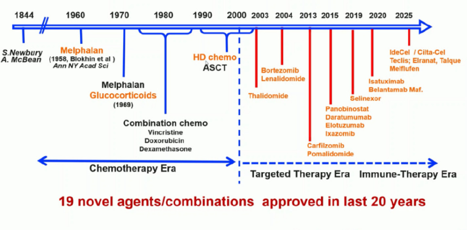 在治疗策略层面,San Miguel教授总结了过去60年的飞跃。从1960年美法仑的发现,到近20年间19种新药或组合的问世,MM患者的生存率已大幅提升。当前,基于蛋白酶体抑制剂、免疫调节剂和抗CD38单抗的“四药联合”方案,已在多项临床试验中证实优于传统三药方案,其带来的深度缓解甚至开始挑战自体移植的“基石”地位。