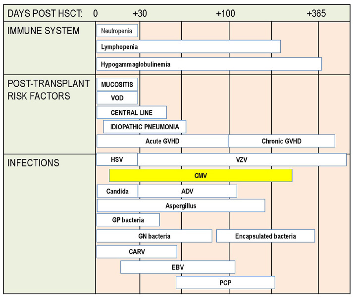 移植后患者的免疫状态随时间动态变化,依次经历中性粒细胞减少、淋巴细胞减少及低丙种球蛋白血症阶段,这一过程与多种风险因素叠加,进一步升高巨细胞病毒感染风险,如移植后黏膜炎、肝静脉闭塞病(VOD)、中心静脉导管留置、特发性肺炎、急慢性GVHD,以及同时存在的其他病原体感染(如 HSV、VZV、EB病毒、念珠菌、腺病毒、曲霉菌、革兰阳性菌、革兰阴性菌、有荚膜细菌、肺孢子菌等)。