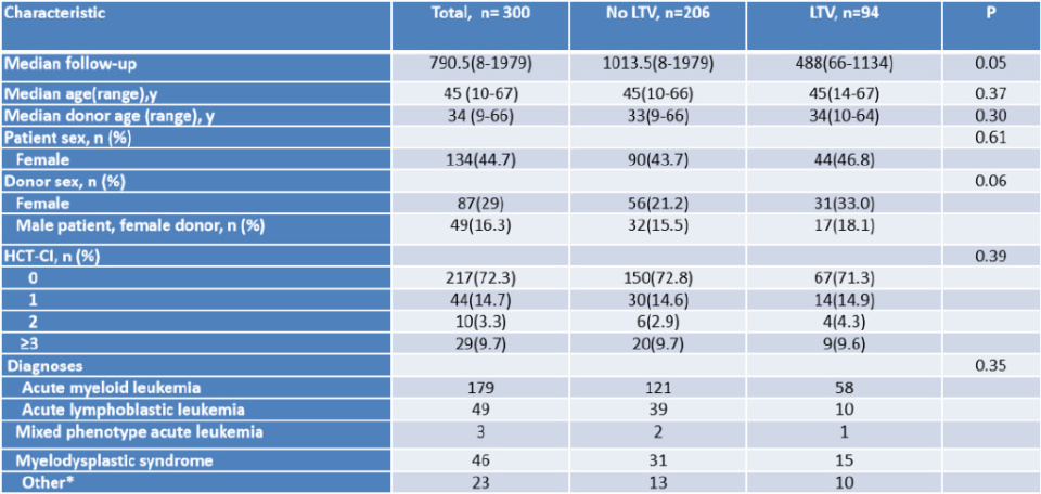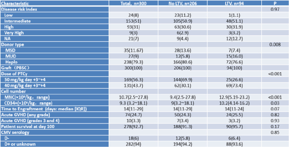 研究共纳入300例患者,其中无来特莫韦预防组(NoLTV组)206例,来特莫韦预防组(LTV 组)94例。两组患者的基线特征整体均衡,具体见下图。