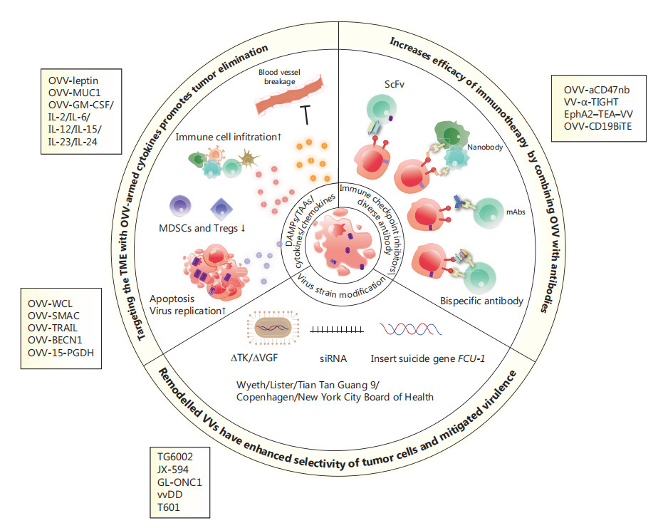 溶瘤病毒疗法作为癌症治疗手段展现出巨大潜力,但其单药疗效往往有限,这仍是癌症治疗领域面临的持续挑战。为解决这一问题,需要通过创新的改造策略和联合治疗来提升溶瘤病毒(OVs)的有效性。钱文斌教授团队2023年在Cancer Biol Med发表的一项研究,系统综述了当前关于工程改造突变病毒和携带外源基因的溶瘤痘苗病毒(OVV)在体内外逆转肿瘤微环境(TME)并增强抗肿瘤活性方面的研究进展,并对正在进行的临床试验及联合治疗进行了概述。