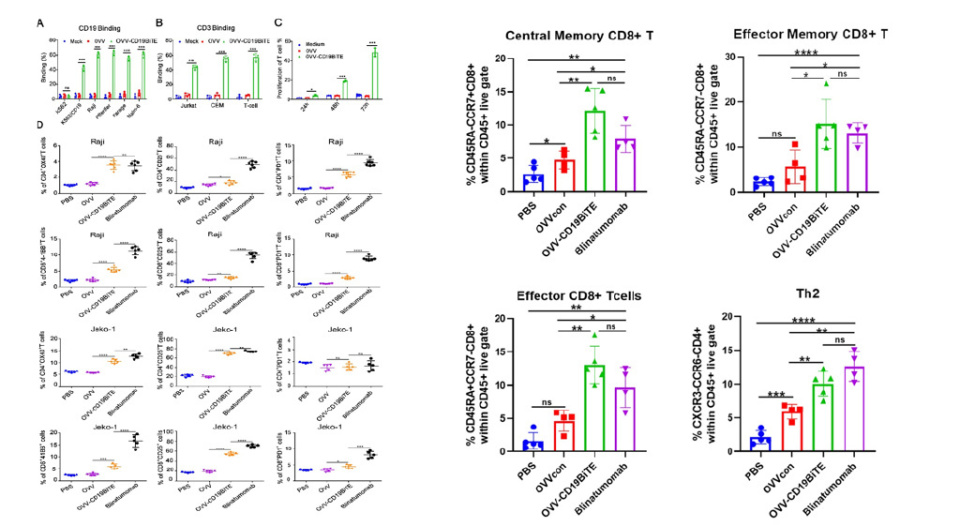 在2022年发表于Blood Cancer J的研究中,钱文斌教授团队成功构建了一种能够编码CD19特异性BiTE的溶瘤痘苗病毒(OVV-CD19BiTE)。结果表明,OVV-CD19BiTE的复制能力及诱导溶瘤的效果与其亲本病毒相似。来自OVV-CD19BiTE感染细胞的上清液可有效激活并促进人T细胞增殖,同时也验证了该病毒的旁观者效应。体内实验显示,OVV-CD19BiTE可选择性地在肿瘤组织内复制,并使肿瘤中CD3、CD8及初始CD8 T细胞亚群的比例显著高于贝林妥欧单抗。