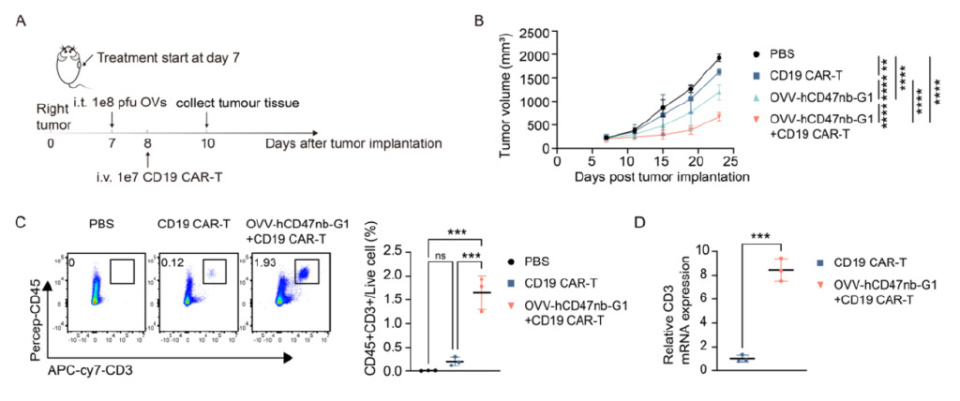 值得注意的是,OVV-hCD47nb-G1与CD19嵌合抗原受体T(CAR-T)细胞联合使用,可以协同改善皮下淋巴瘤的治疗效果,克服CAR-T细胞浸润有限这一关键障碍。该研究表明,携带CD47阻断纳米抗体和IgG1 Fc的OVV,可构建一个双功能治疗平台,通过协同激活先天性和适应性免疫,为淋巴瘤免疫治疗提供一种颠覆性的策略。