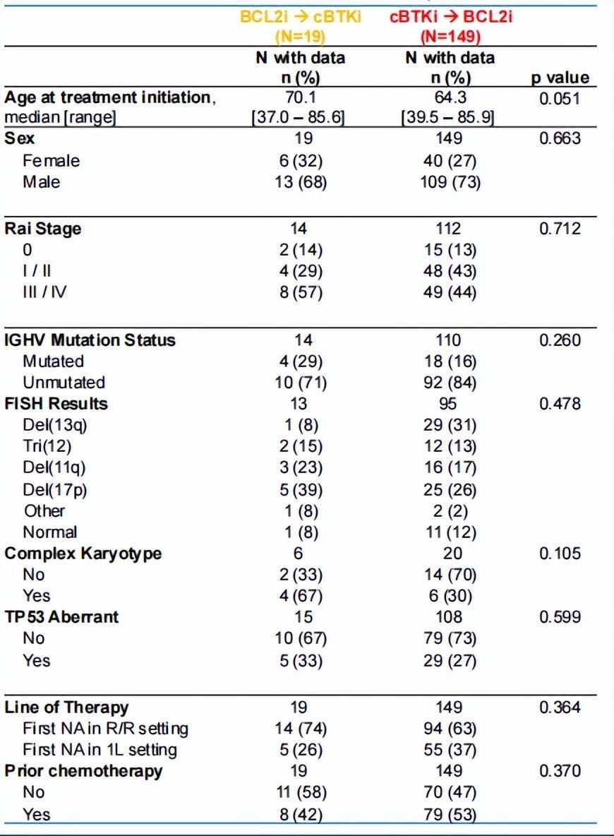 149例患者接受cBTKi→BCL2i治疗,19例患者接受BCL2i→cBTKi治疗。在首次使用新型药物时,患者的中位年龄为65岁(范围:58-73岁),其中73%为男性,45%为Rai III/IV期,82%(102/124)为IGHV未突变,28%(34/123)为TP53异常。尽管接受cBTKi→BCL2i治疗的患者相对较年轻(中位年龄64.3岁vs. 70.1岁,P=0.051),且TP53异常的比例较低(27% vs. 33%,P=0.599),但两组患者的基线特征间差异无统计学意义(见表1)。