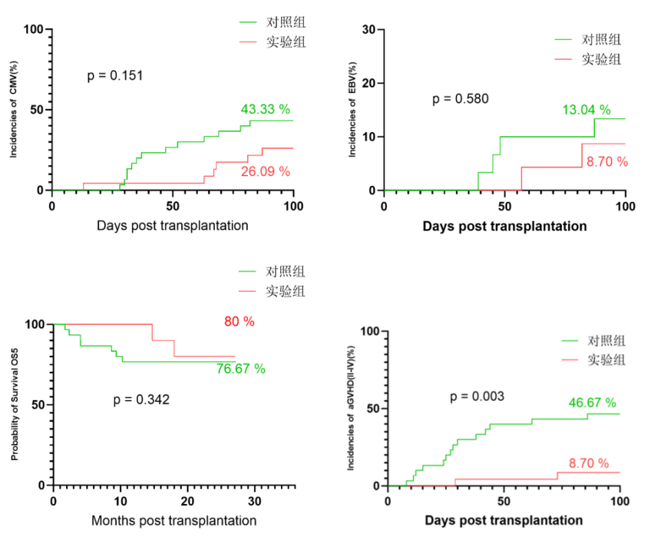 对照组30例,发病中位年龄7.00岁,其中急性淋巴细胞白血病19例,急性髓系白血病11例。试验组23例,发病中位年龄9.00岁,急性淋巴细胞白血病9例,急性髓系白血病12例,急性混合细胞白血病2例。试验组应用来特莫韦中位时间:+1天(+1天-+3天),应用来特莫韦的中位时间100天(28天-100天)。试验组移植后100天CMV发生率为26.09%,低于对照组(26.09% vs. 43.33% P=0.151),移植后100天EBV发生率为8.07%,低于对照组(8.07%% vs. 13.04% P=0.580),aGVHD发生率为39.13%,低于对照组(39.13% vs. 73.33% P=0.009),其中(Ⅱ°-Ⅳ°)发生率为8.70%,明显低于对照组(8.70% vs. 46.67% P=0.003)。试验组随访期间2例患者复发,给予治疗后均再次达到完全缓解。2例患者死亡,均死于感染。预估3年的生存率(等同于无病生存率)为80.00%,略高于对照组(80.00% vs. 76.67% P=0.34),预估3年的复发率为9.57%,低于对照组(9.57% vs. 22.03% P=0.292)。