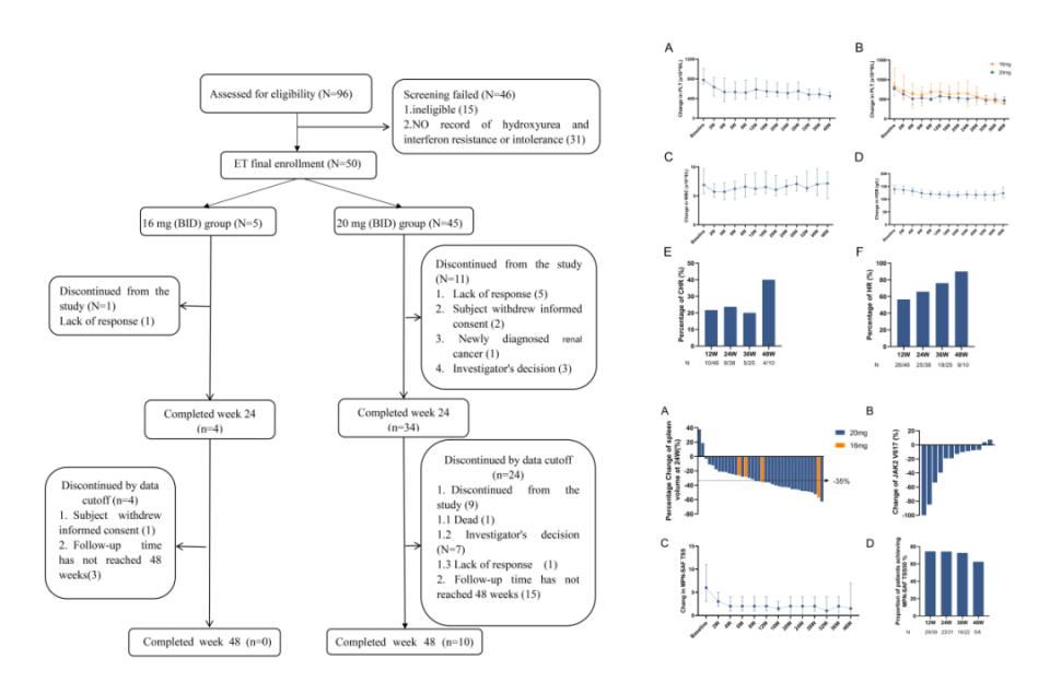 受试者接受OB756 16 mg(探索性亚组,n=5)或20 mg(n=45)每日两次口服,以28天为一个周期,直至疾病进展或无法耐受。主要终点为第2周的完全血液学缓解(CHR),次要终点包括:血液学缓解(HR)率; 安全性与耐受性;分子学缓解率;第24周脾脏体积较基线缩小 ≥35% 的患者比例(SVR35); 疾病相关症状。