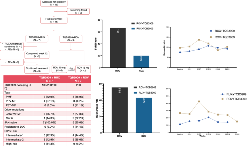 本研究是多中心、开放标签Ib/II期试验(NCT06245941),共5个中心。纳入≥18岁、DIPSS中危-1及以上、JAKi初治或耐药的MF患者,需有可触及脾肿大或影像学脾体积≥450 cm³。根据研究者判断给予芦可替尼(RUX)或罗伐昔替尼(ROV)联合TQB3909。RUX队列进行TQB3909(100/200/300 mg QD)递增;ROV队列采用3+3设计(10 mg、15 mg bid)。主要观察脾脏缩小、症状评分(TSS)变化、血红蛋白与血小板动态及不良事件。