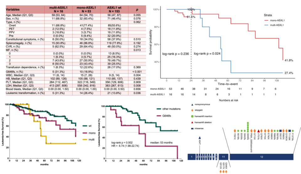 multi-ASXL1是MF患者LT风险的独立不良因素,尤其在长期随访中表现突出。其不良预后部分可能由高危变异(如G646fs)的富集所致。