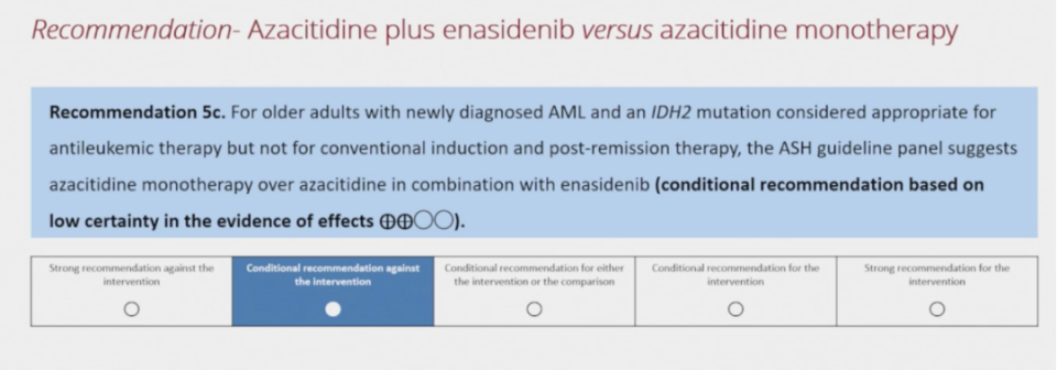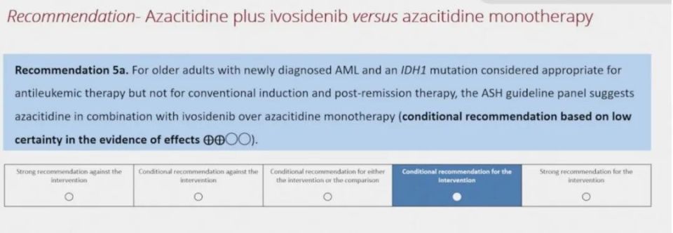 Professor Mikkael Sekeres:We have discussed this issue in our panel. For example, when considering treatment options for IDH1 mutations, we debated between Azacitidine combined with Ivosidenib and Azacitidine combined with Venetoclax. Based on the available data, it is not clear which regimen is more effective. Therefore, the expert panel concluded that we cannot make a specific recommendation in this area and suggested that the decision be left to the clinician. Both treatment options are viable and have clinical utility.